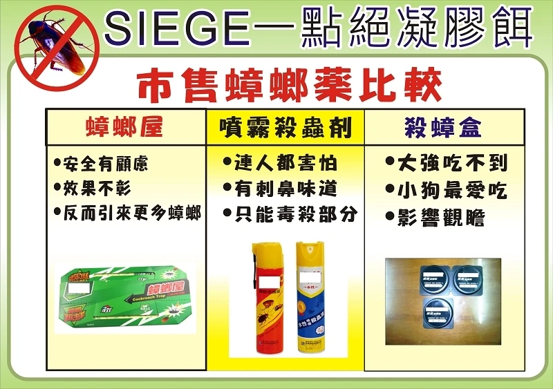*不給逃:黏蟑屋使用在環境衛生良好,或對殺蟲劑敏感的場所是不錯的選擇。但蟑螂繁殖速度太快,黏不勝黏,是其缺點。