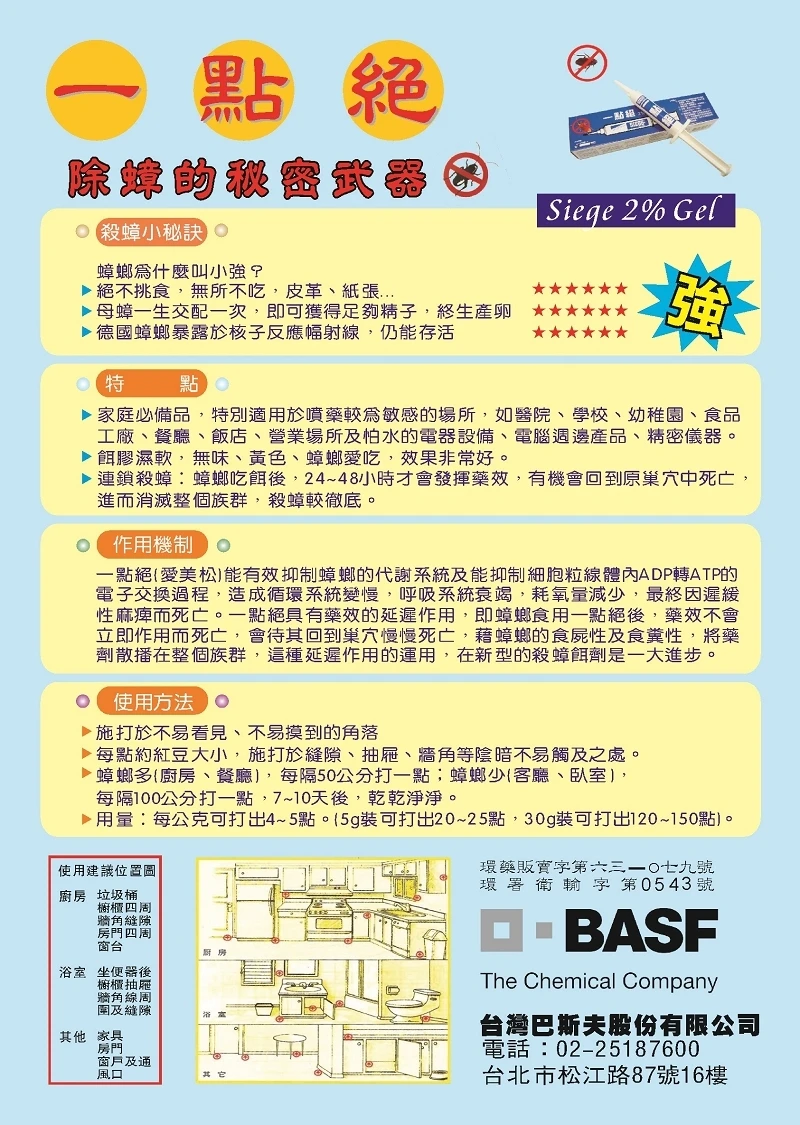 c、餌膠:針對上述缺點及蟑螂之生態習性,於最近10年發展出餌膠。餌膠乃將毒餌,如愛美松、芬普尼、硼酸、陶斯松等混以矽膠製成,無色無味,柔軟好吃。以點狀打在蟑螂棲息之陰暗縫隙、裂縫內,一方面可以毒餌誘蟑螂,另方面,如果毒餌具有二次中毒效果者,可藉蟑螂的食屍性及食糞性,造成連鎖殺蟑,效果更徹底。